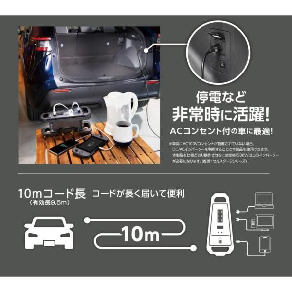 ◆電気の使用量を監視して安全に有効活用できるコードリール10m ◆車から電気を安全に引きだせる EV車、HEV車、ガソリン車、制限電流15A(※車両にAC100Vコンセントが搭載されていない場合、DC/ACインバーターが必要です) ◆AC100Vコンセント 家庭用コンセントと同じAC100Vを3口搭載 ◆USB出力端子 自動識別機能付き 汎用性の高いTypeA(2.4A)を2口搭載 ◆電流表示メータ- 使用電流が見える! ◆保護機能通知ランプ+警告アラームで電気の使いすぎから車を守る 14A (点滅「赤」)、15A ブレーカーダウン (点灯「赤」 + 警告アラーム)、ブレーカーが落ちてしまっても解除スイッチを長押しすることで簡単復帰 ◆車にACコンセントがあれば接続カンタン! ◆持ち運びや保管にも便利、取手付きで持ち運び簡単、コードを収納、省スペース収納 ■ 仕 様 ■ 入力定格:AC100V 50/60Hz 56VA AC定格:合計5A(巻取時)/合計14A(引出時) 制限電流:15A ACコンセント:3口、2ピンタイプ(接地なし) コード仕様:HVCTF 2.0㎟×2C コード長:10m(有効長9.5m) USB端子出力電圧:DC5V USB端子出力電流:2系統 2.4A+2.4A (合計4.8A) サイズ(突起部除く):139(W) × 305(D) ×140.5(H) 重量:1.9kg